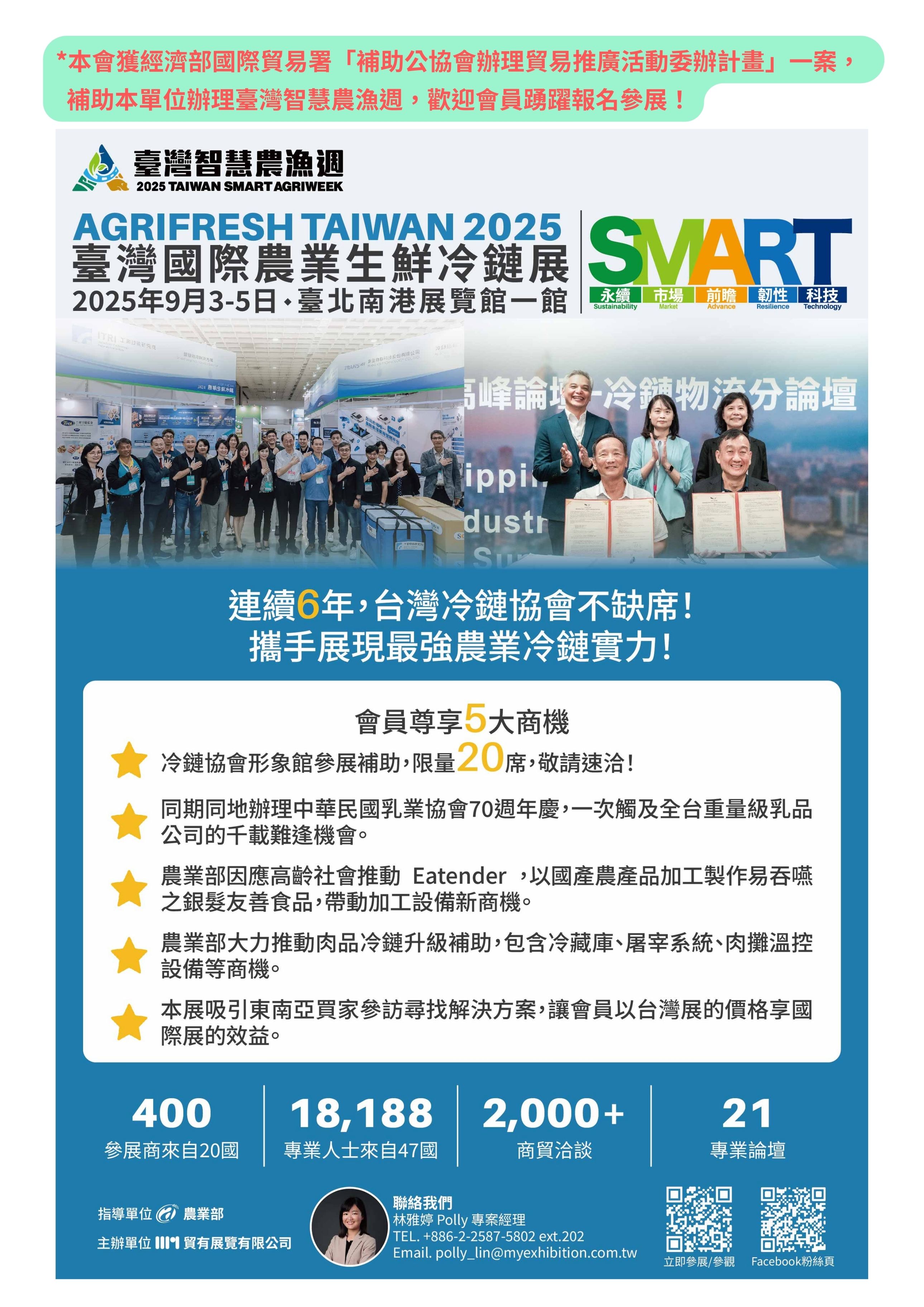 *本會獲經濟部國際貿易署「補助公協會辦理貿易推廣活動委辦計畫」一案,補助本單位辦理臺灣智慧農漁週,歡迎會員踴躍報名參展!