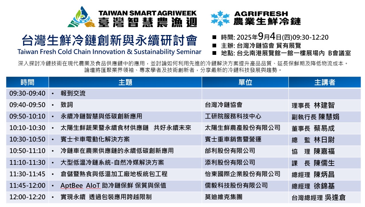 這場盛會匯集了冷鏈產業最頂尖專家,將於2025年9月4日在臺北南港展覽館舉辦, 深入探討永續冷鏈的創新應用,從智慧科技到低碳運輸,為您的事業注入成長新動能。