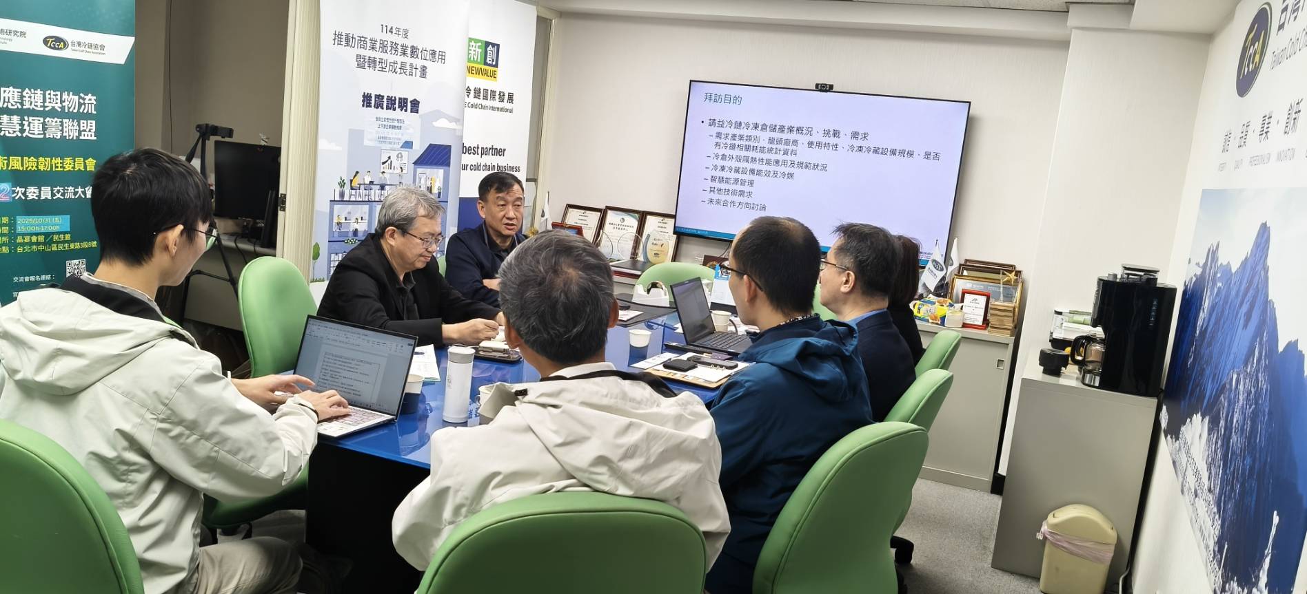 首先由余培煜博士說明工研院7個所,5個中心正職員工6600名,博士學位約18.8%規模的概要。陳怡靜小姐介紹有關歐美,日本台灣有關食品冷鏈供應的能源電力消耗統計現狀。余培煜博士提出到協會拜訪的幾個目的,請益冷鏈冷凍倉儲產業概況、挑戰、需求