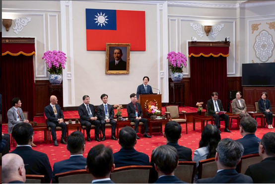 訪賓一行由數位發展部次長侯宜秀陪同,前來總統府晉見總統,總統府秘書長潘孟安也在座。