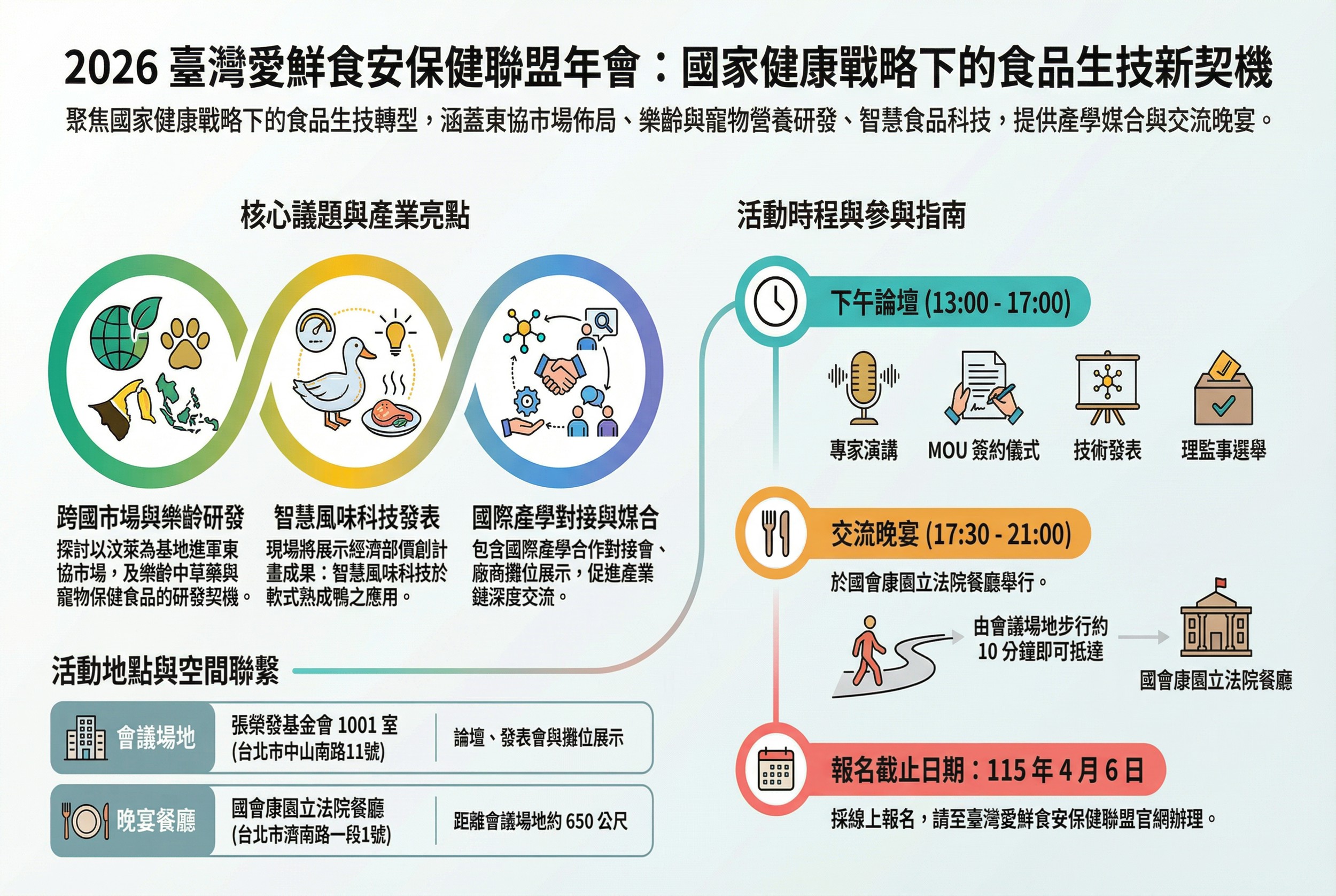 應愛鮮食安保健聯盟龔瑞林理事長(協會友好會友)邀請,陪同理事長出席於張榮發基金會國際會議中心論壇。「臺灣愛鮮食安保健聯盟」(iFRESH 簡稱愛鮮聯盟)積極專注國內食農保健餐飲之產業供應鏈發展,期盼孕育出一個務實的產官學研跨領域大健康交流平台,推展互動關係引領整合、並聯盟尋求國際化技術交流與合作機會。 本次2026年會謹舉辦「 國家健康臺灣戰略下的食品生技產業新契機 Food Biotech Opportunities in Taiwan's National Health Strategy」,並以 食安、保健、智慧、永續-整合四個主題交流分享促進跨域合作。另安排日本及新加坡創業加速器參與活動,並展現經濟部科研成果價值創造計畫。